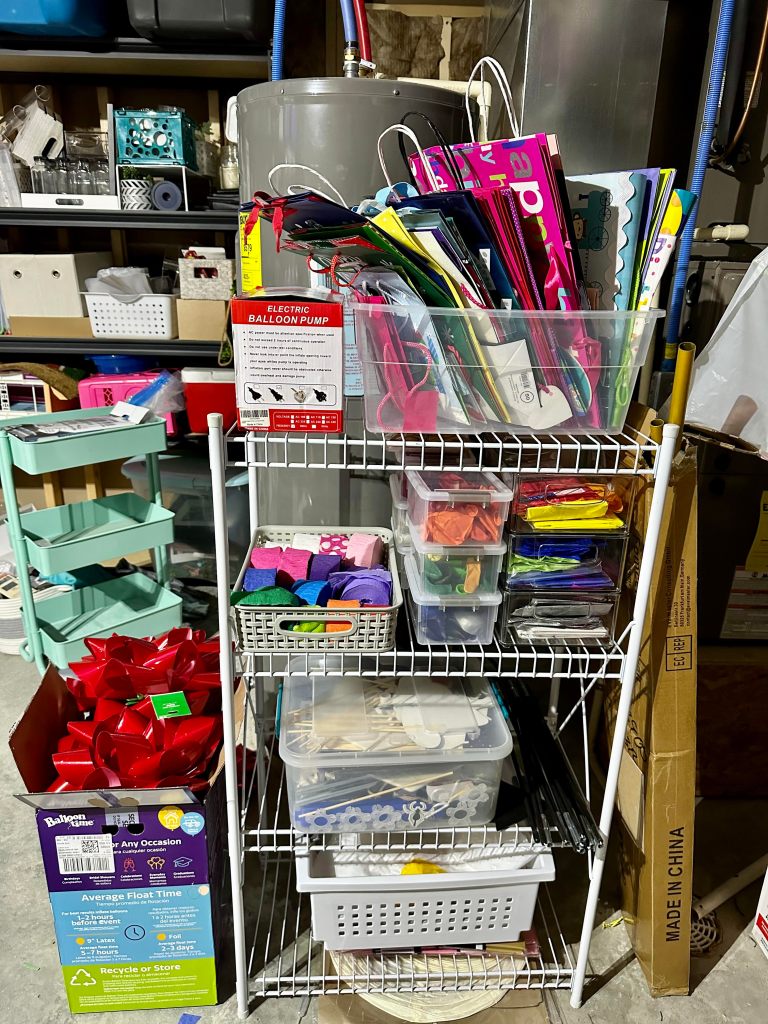 Gift Wrapping: I love party planning. Everything about it gets me excited. So I needed an area with balloons, streamers, signs, helium, electric pumps, archways, gift bags, tissue paper and everything in between. I store it all on this metal shelf. Truth be told, I could probably use a bigger station. But it works. The gifts bags you see are recycled ones. I always save the gift bags from my kids’ parties, etc.