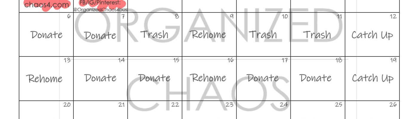 For August’s calendar we are, once again, decluttering! We will spend September and October cleaning. But it’s just too hot in August. And, you can never declutter too much, right??