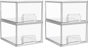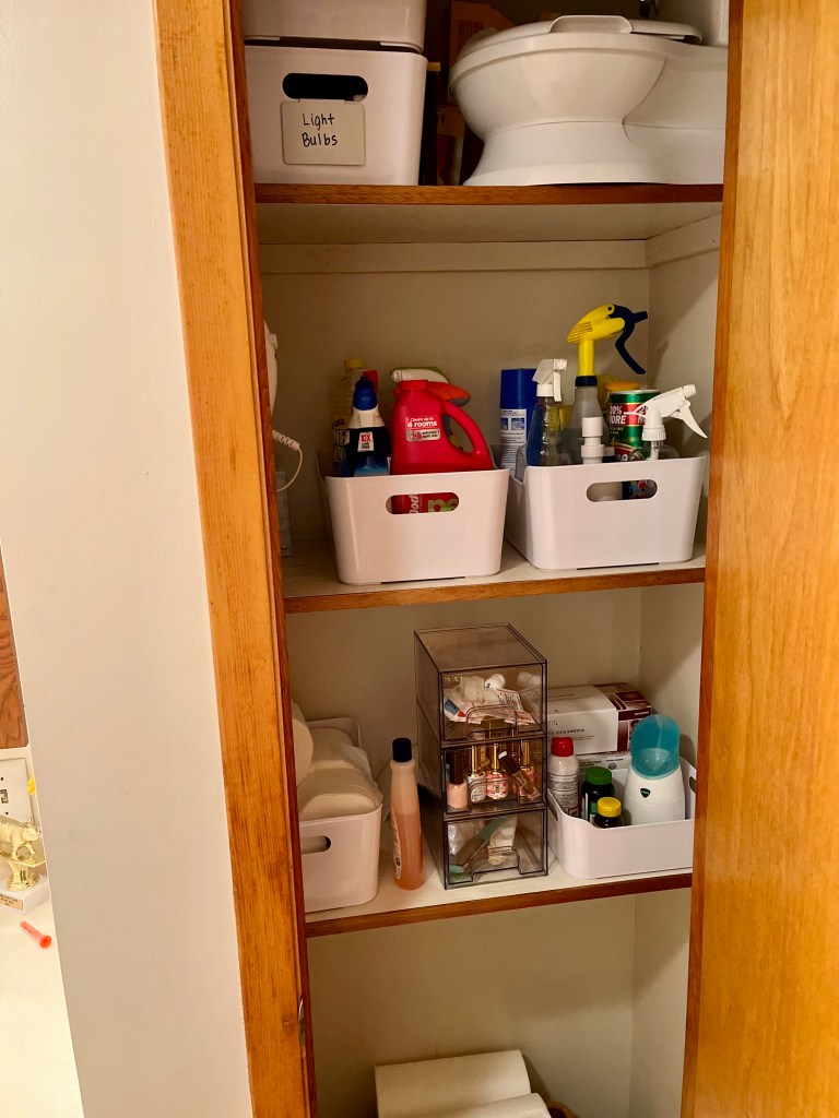 These are great for corralling objects. I use them in my freezer. A problem a lot of bathrooms have is that there’s no good way to grab something from the back of the shelf without knocking over everything in front of it. With these bins, you can slide them back and forth to grab objects easily.