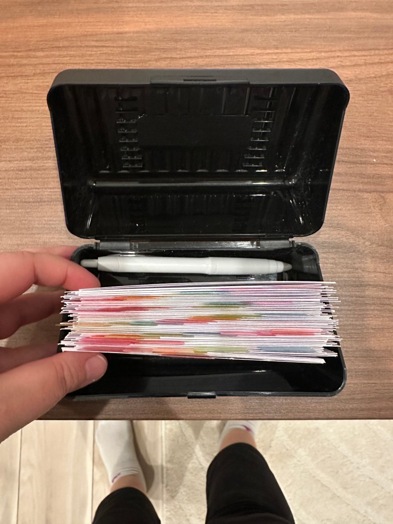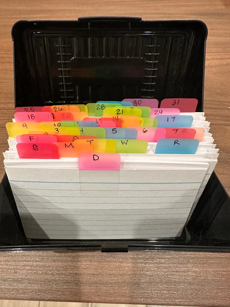 - As you start to fill in your DATE slots, you will grab all the ones from the current date and you’ll review those. So for instance if today is the 5th, you’ll grab every card from the “5” slot.