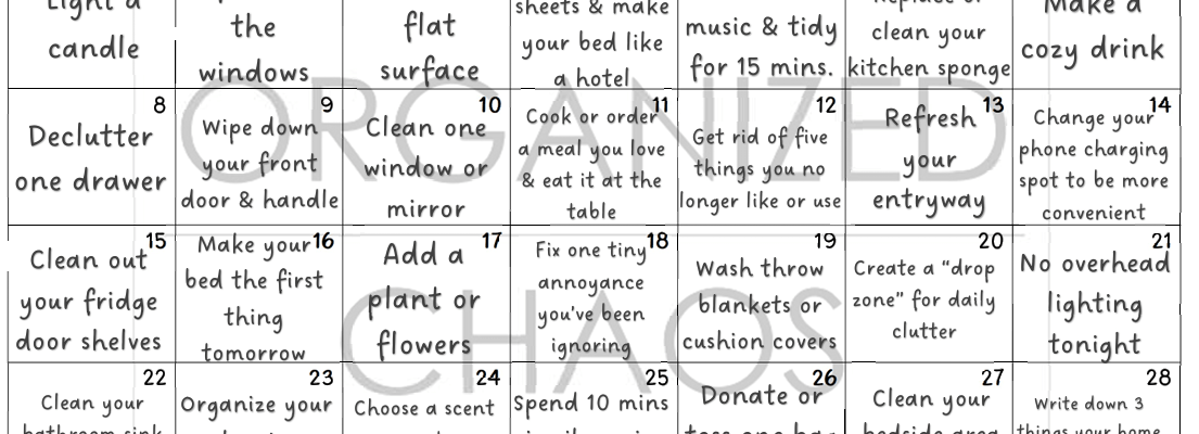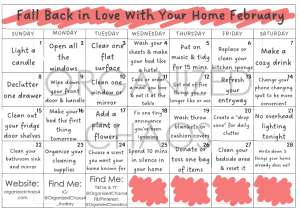 For this month, we are going to fall back in love with our homes. Laundry, dirty dishes, piles of papers… it’s easy to forget all our home does for us. So for February I’ve assigned tasks that allow us to remember what the gift of home feels like. Enjoy!