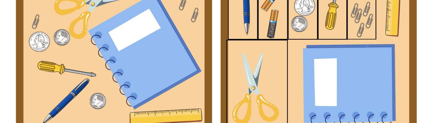 If you want to have a clean house, you have to find a place for everything you own. I don’t mean letting your items float around in cabinets or on shelves or in drawers. I mean create physical boundaries for every possession you own. Every paperclip needs four walls around it. A hairbrush needs four walls around it. A fork needs four walls around it. I made this nifty graphic to illustrate this. See the difference? A perimeter gives your possessions a physical home as opposed to just “that drawer”. There’s no shifting or migrating. Everything stays in place.