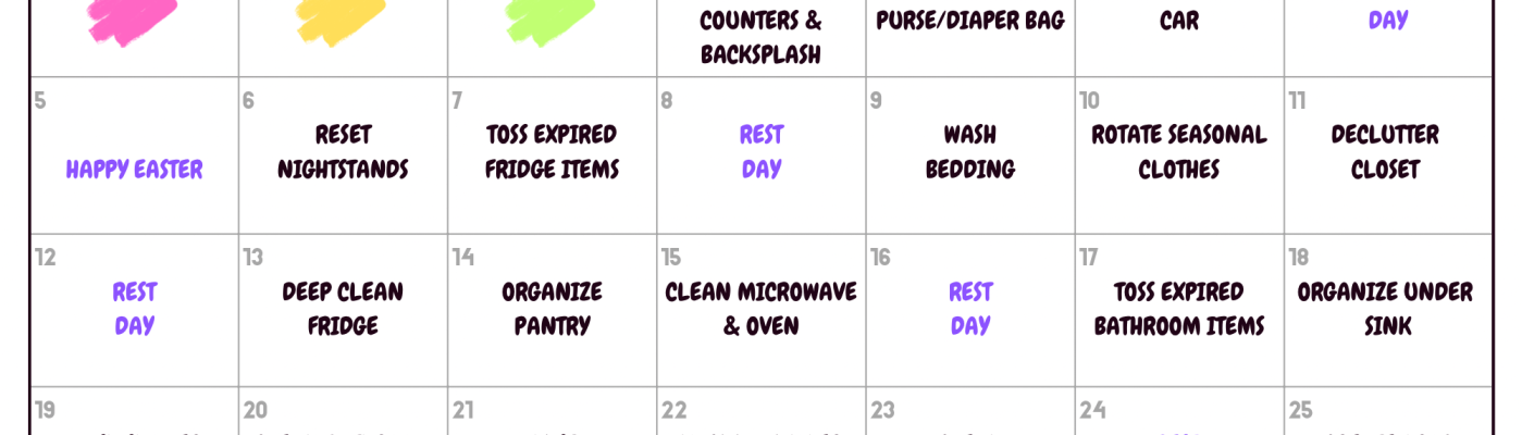 April 2, 2026April 2, 2026 by Organized Chaos - Audrey April Spring Cleaning Calendar April (11 x 8.5 in)Download Share this: Share on X (Opens in new window) X Share on Facebook (Opens in new window) Facebook Like Loading... Related